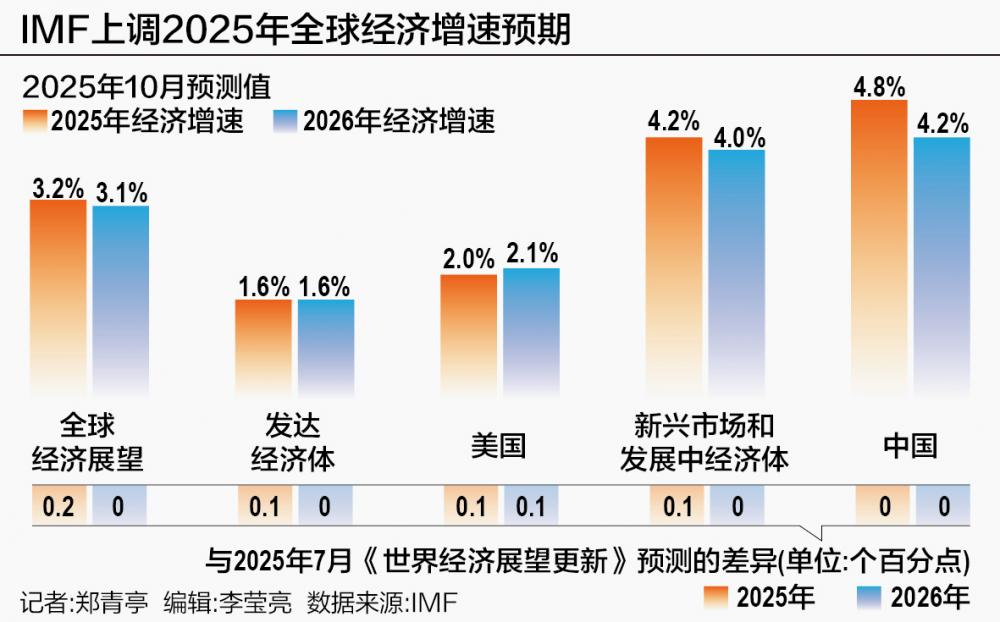在美国重复的贸易政策和关税下,2025年将是全球经济高度混乱的一年。 10月14日,国际货币基金组织(IMF)对经济界最新观点预测称,全球经济增长预计将从2024年的3.3%放缓至2025年的3.2%和2026年的3.1%。相比2025年7月“更新经济经济”,这一增速的预估没有变化(今年提高了0.2个百分点),反映出全球经济对贸易贸易的适应。