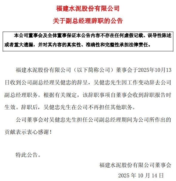 10月14日,福建水泥发布《副总经理公告》公告显示,吴建中先生因工作变动,辞去公司副总经理职务。...